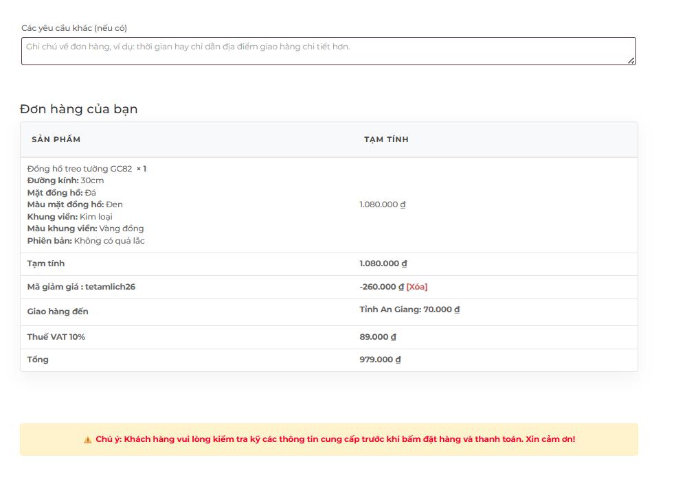 5 - Sau khi điền đủ thông tin, áp dụng mã giảm giá (nếu có) khách hàng kiểm tra lại lần nữa giá tiền sau khi đã áp mã giảm giá và bấm vào ĐẶT HÀNG