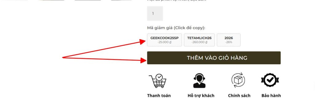 3 - Bấm vào mã giảm giá (nếu có) - khi bấm click, mã sẽ tự động copy để áp mã giảm giá trong trang thanh toán. Bấm thêm vào giỏ hàng để đi đến thanh toán.