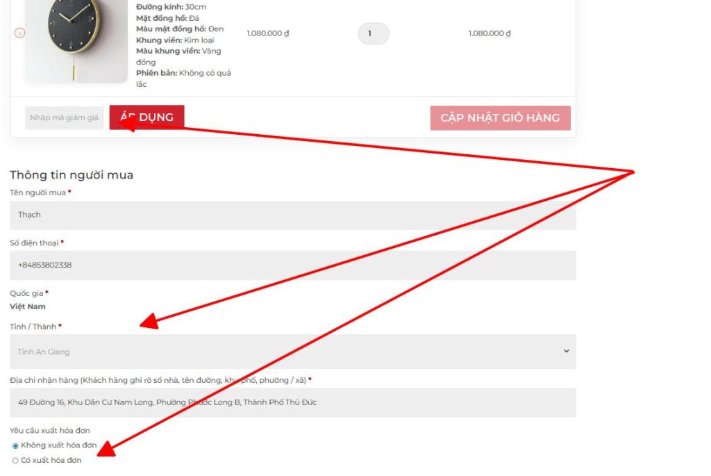 4 - Tại trang THÔNG TIN ĐƠN HÀNG Khách hàng xem lại các tùy chọn sản phẩm, điền chính xác thông tin người mua gồm: tên - số điện thoại (để nhận hàng) - chọn tỉnh thành - nhập địa chỉ chi tiết (để nhận hàng)
